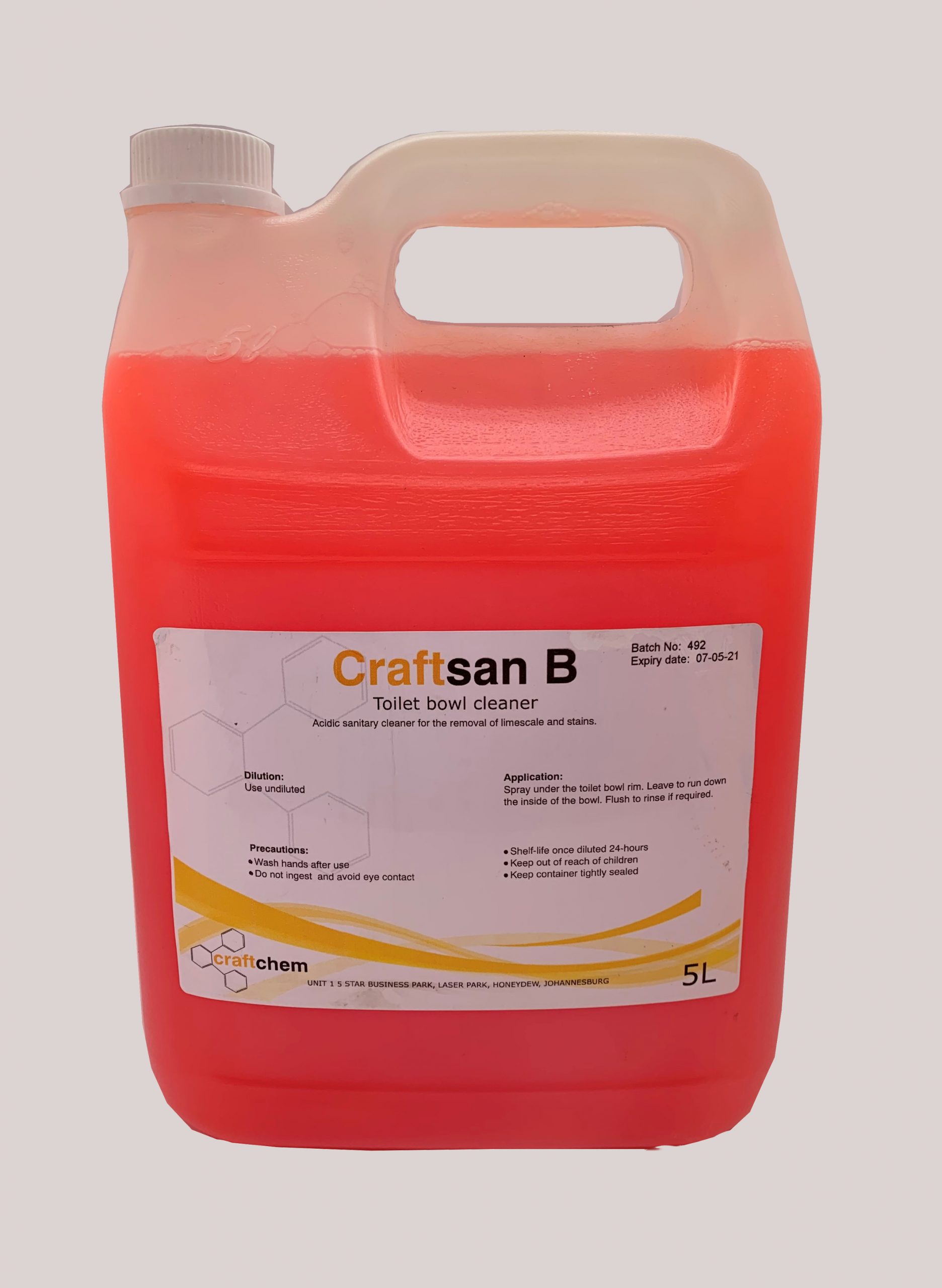 Craftsan B – Acidic toilet bowl cleaner for the removal of limescale and urinary stains. Can also be used for the removal of limescale build up on shower doors and other glass surface. Effective grout cleaner in showers and other sanitary environments. Keep off of natural stone with a lime content. Will cause damage to aluminium,